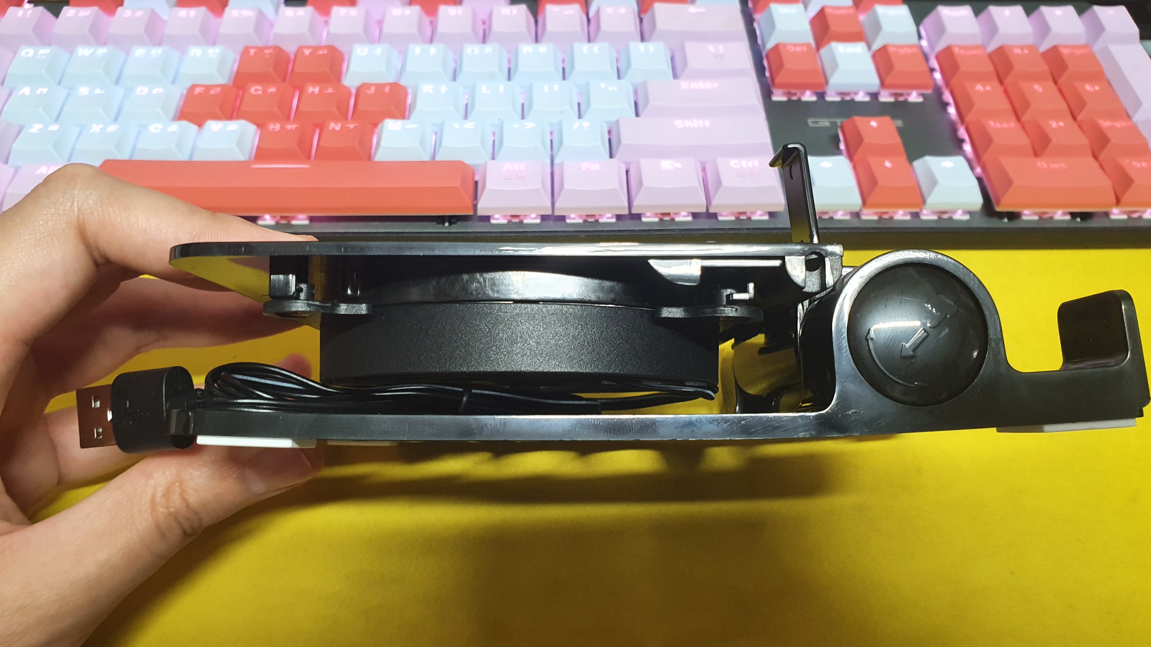제품의 구성은 매우 간단합니다. 각도조절이 되는 스탠드와 팬 그리고 전원을 공급해줄 USB 선.