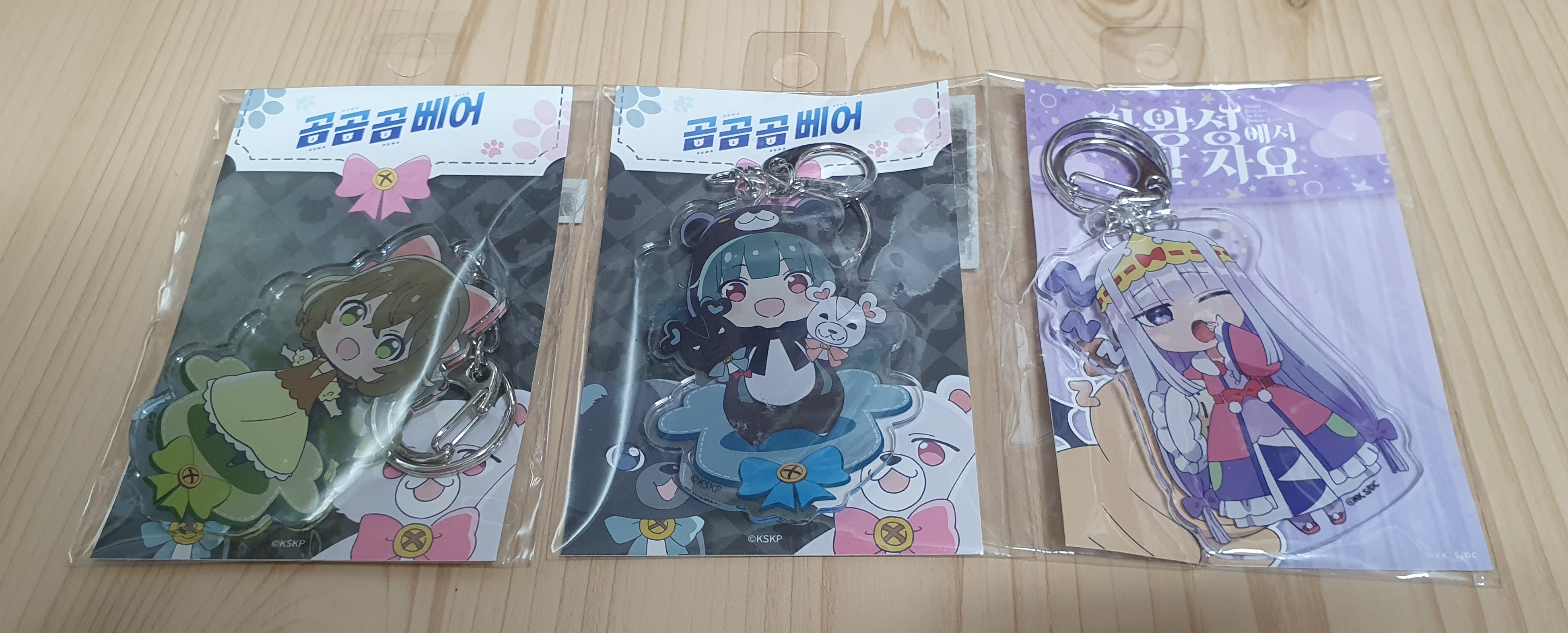 '곰 곰 곰 베어'는 저기에 백곰 키링이 하나 더 있고, '마왕성에서 잘 자요'는 산책하는 키링이 하나 더 있습니다.