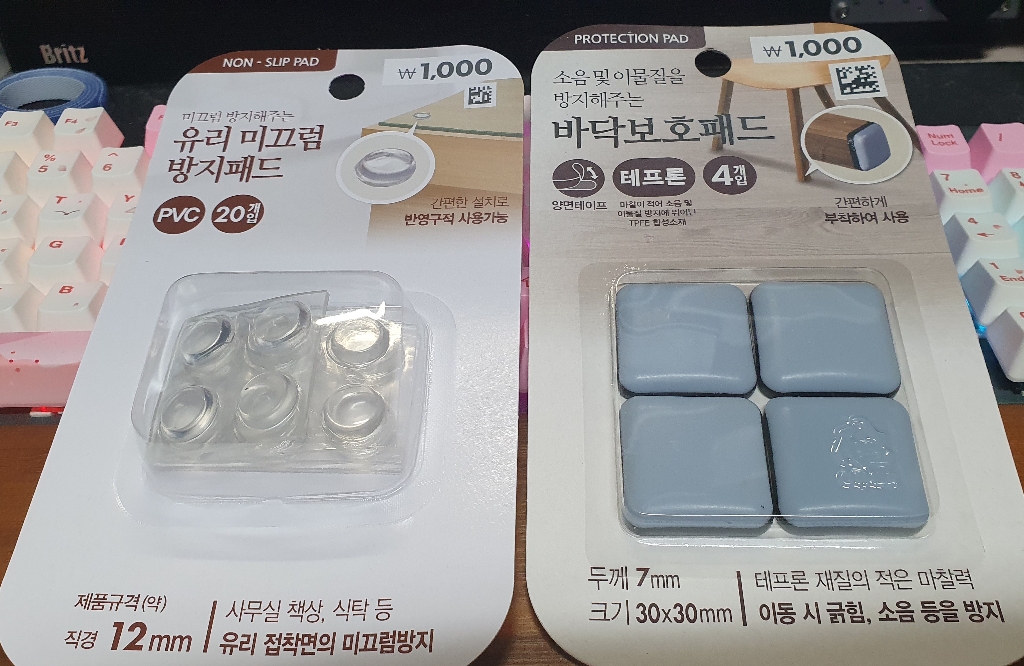 다이소에서 유리 미끄럼 방지패드(흔히 범폰이라 많이 하는)와 테프론 재질의 바닥보호패드를 사왔습니다.
