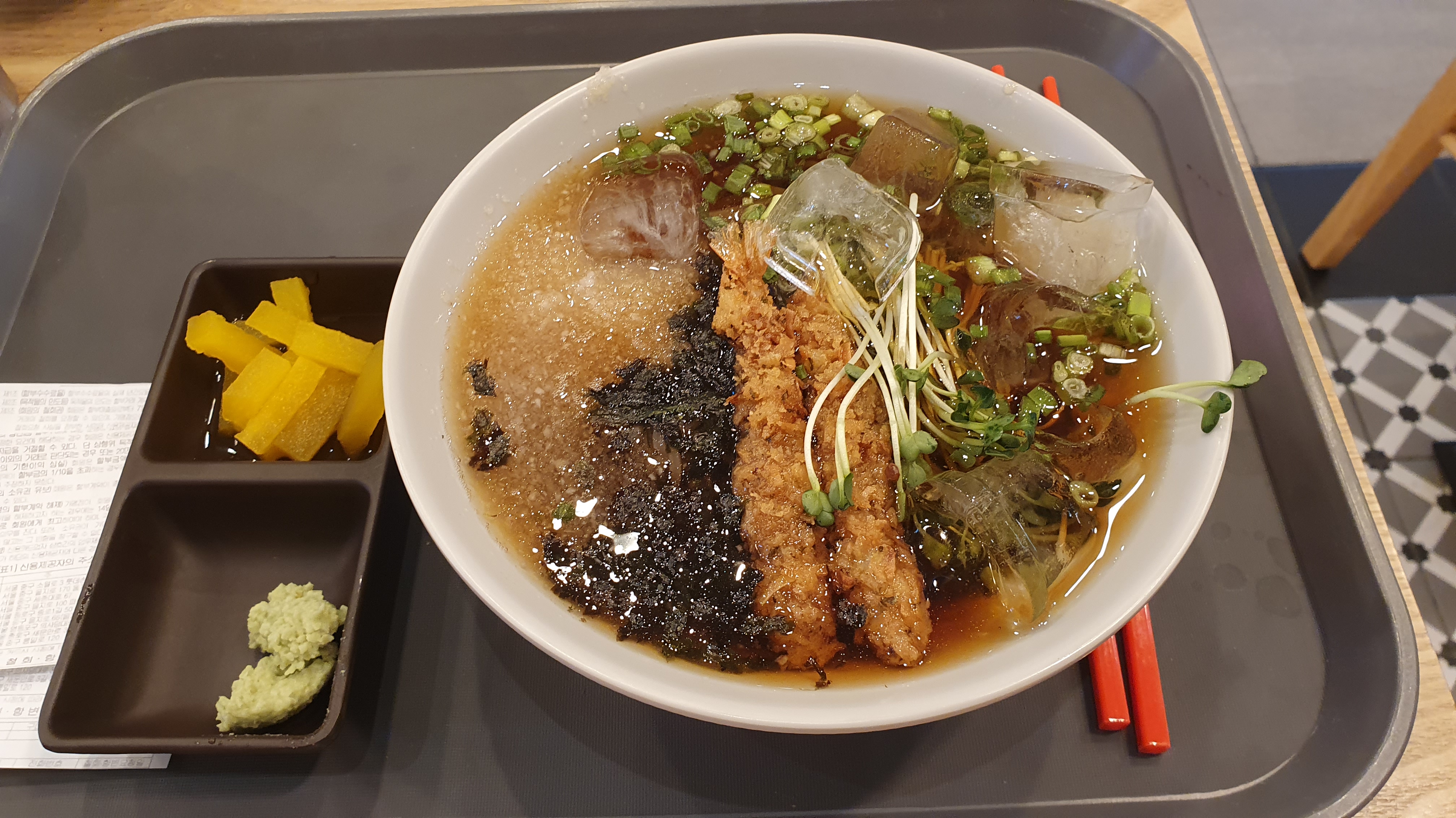 지난 달에 서울성모병원 갔을 때 먹었던 스쿨푸드 냉모밀입니다.
