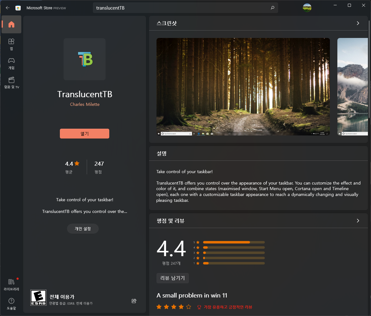 Microsoft Store에서 무료로 구매 및 적용할 수 있는 TranslucentTB입니다.