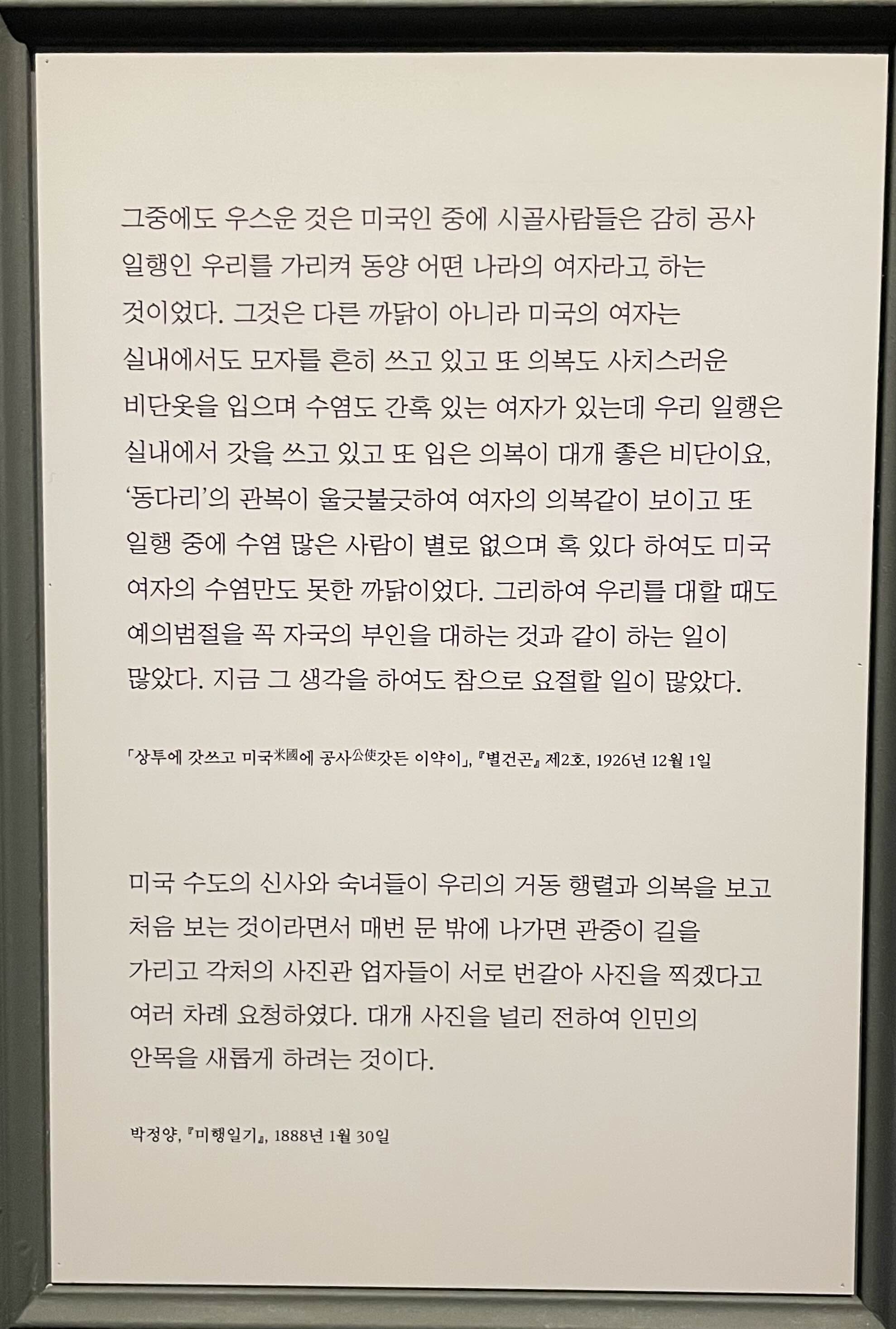 미국 여자들은 실내에서 흔히 모자를 쓰고 사치스러운 비단 옷을 입으며 간혹 수염이 난 여자가 있는데, 조선 공사관원들도 갓 쓰고 여자 의복 같은 관복에 수염까지 있으니 여자로 오해 받은 일이 많다는 이야기. 예의범절도 미국의 부인들을 대하 듯 하고...