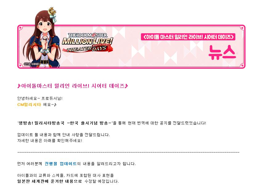 [밀리시타안내] 한국어판 번역 업데이트 예정 안내 사항