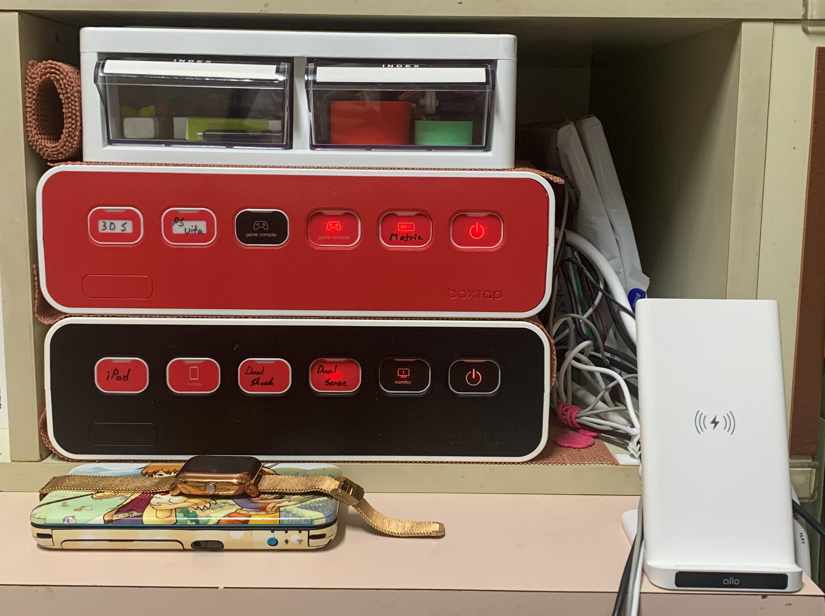 2층(빨강) : 3DS 충전기, PS Vita 충전기, 닌텐도 스위치, PS5, HDMI 4x2 매트릭스